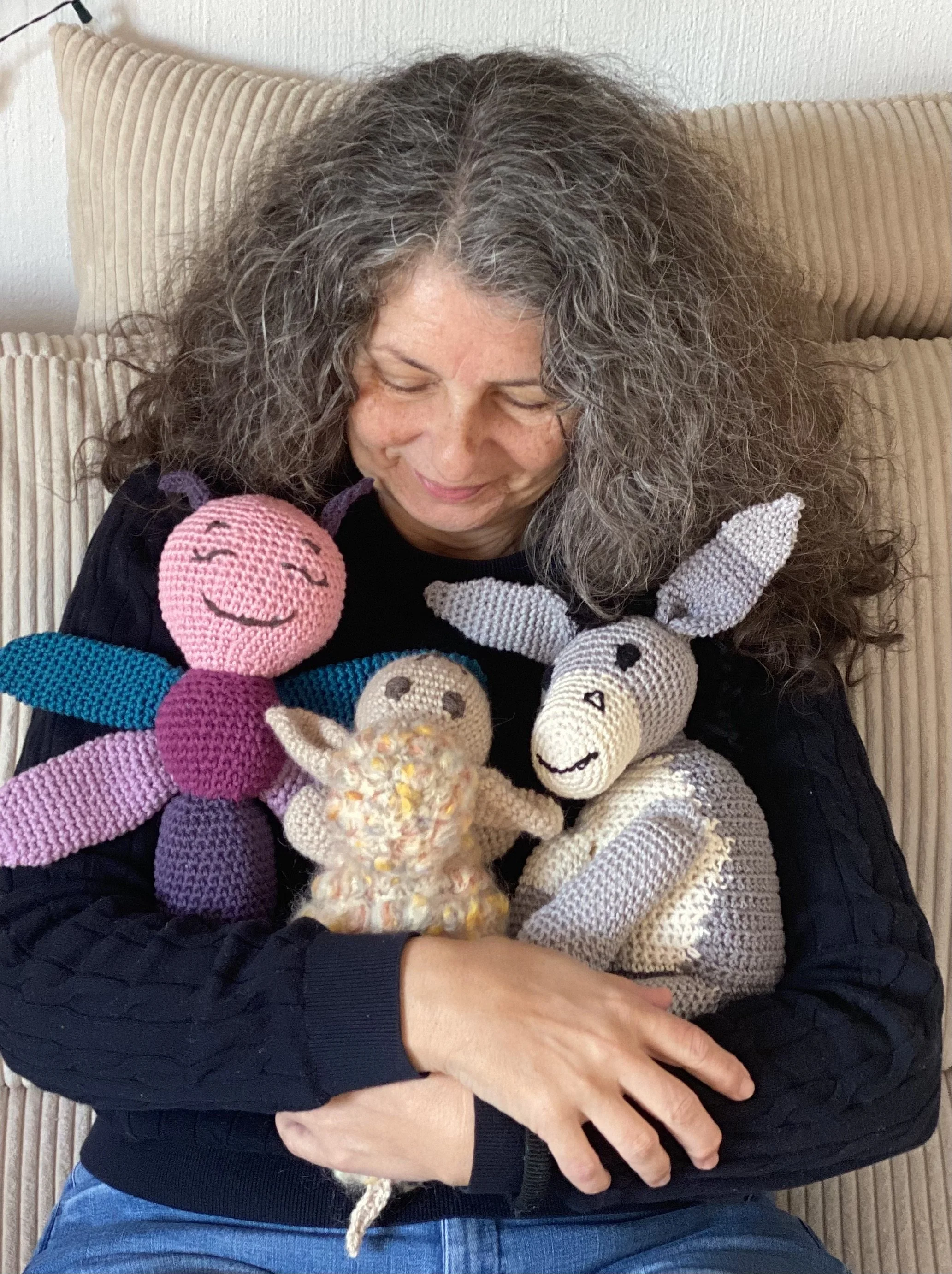 Und wenn ich nicht arbeite, findet man mich mit Wolle in der Hand, strickend, Tiere häkelnd, in der Natur, mit meiner Familie, arabischem Essen umgeben von echten Begegnungen im wahren Leben.